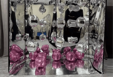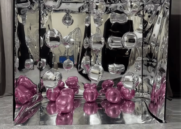 Capture unforgettable moments in our mirrored cube filled with vibrant balloons for stunning photos.